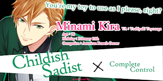 VA: Toshiyuki ToyonagaBorn, raised, and made in the USA. Minami is proudly living the American dream as Owner of the American Branch of the hotel. He takes after his American side, and is a very straight forward guy. As long as he's having fun he's happy, a sadist with a childish attitude.